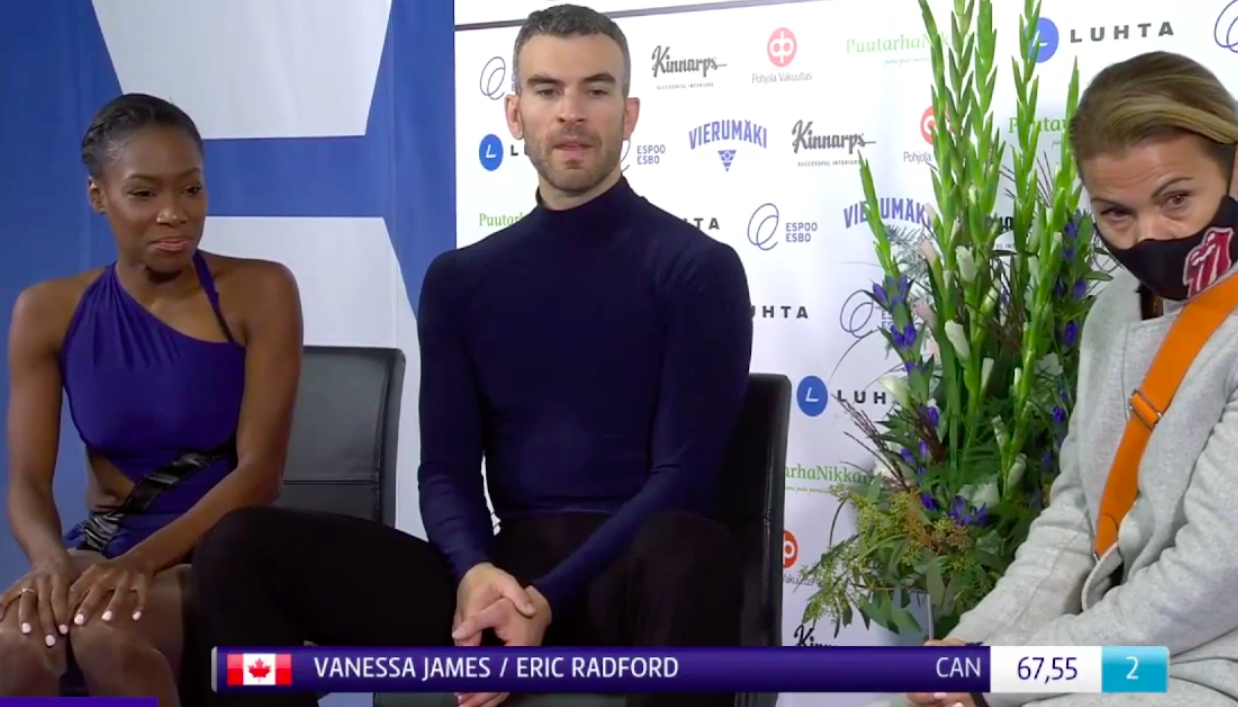 Оценка канадцев Ванессы Джеймс и Эрика Редфорда за короткую программу — 67,55 балла. Очень далеко от Тарасовой и Морозова, которые сейчас — другая лига. Сами канадцы понимающе кивают.