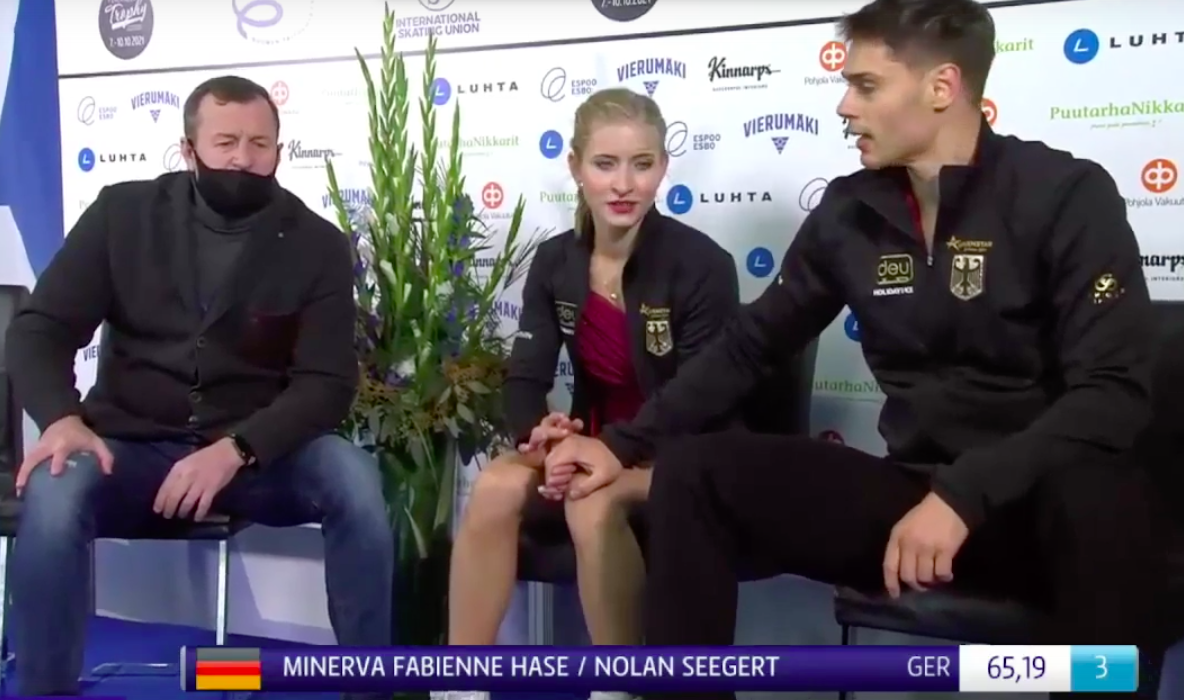Следующими выступают Минерва Хаазе и Нолан Зегерт из Германии. Они катаются под романтичную композицию You Are the Reason (Calcum Scott, Leona Lewis).