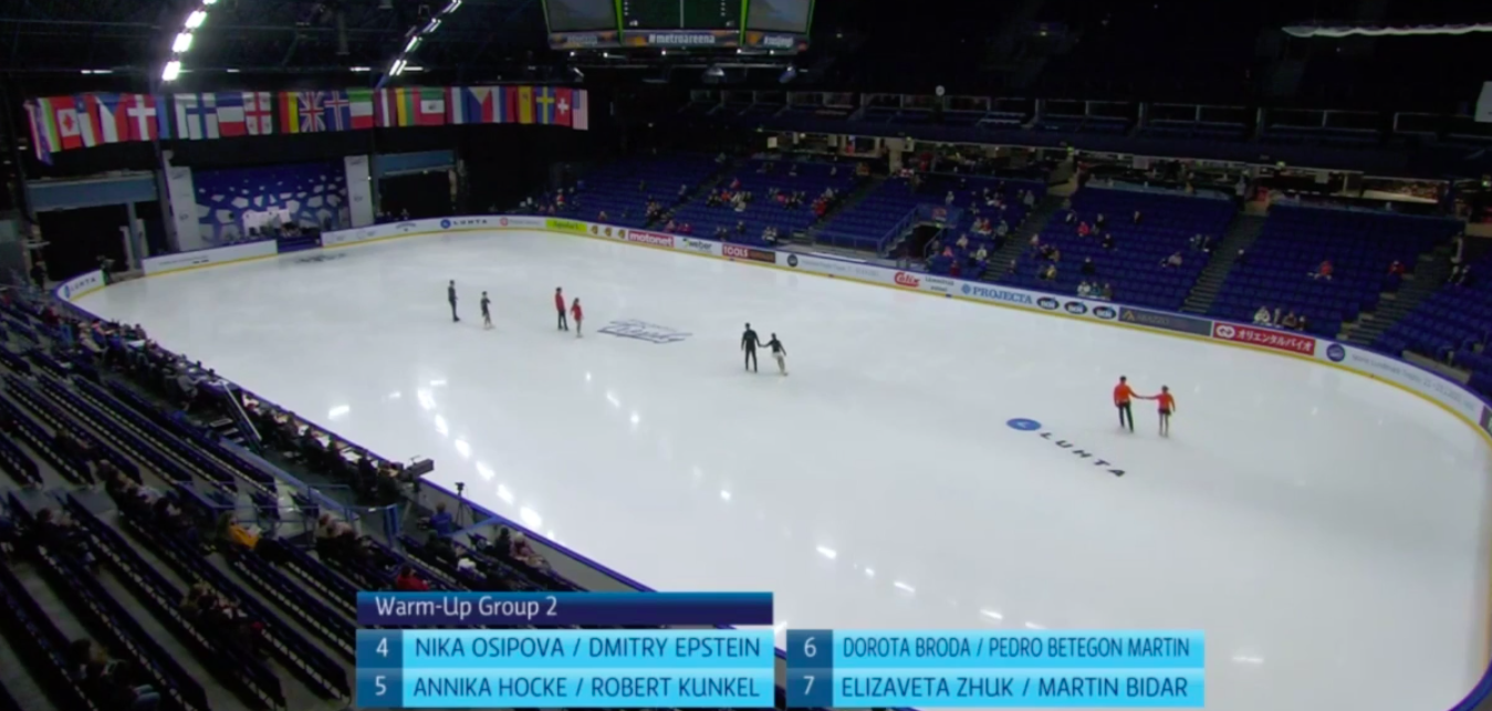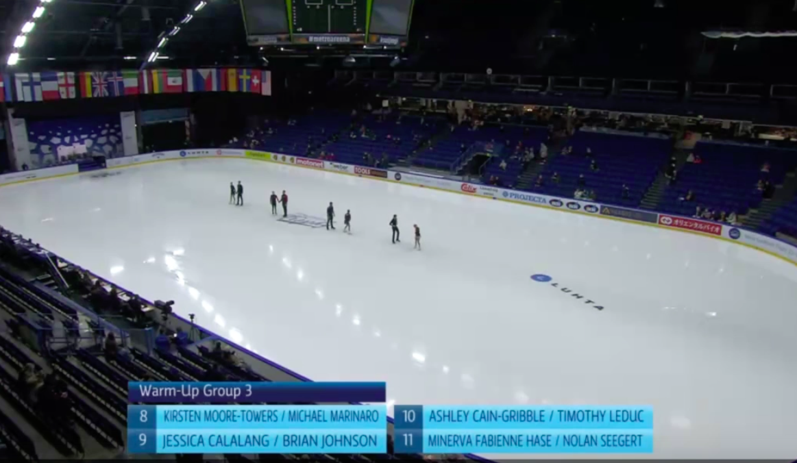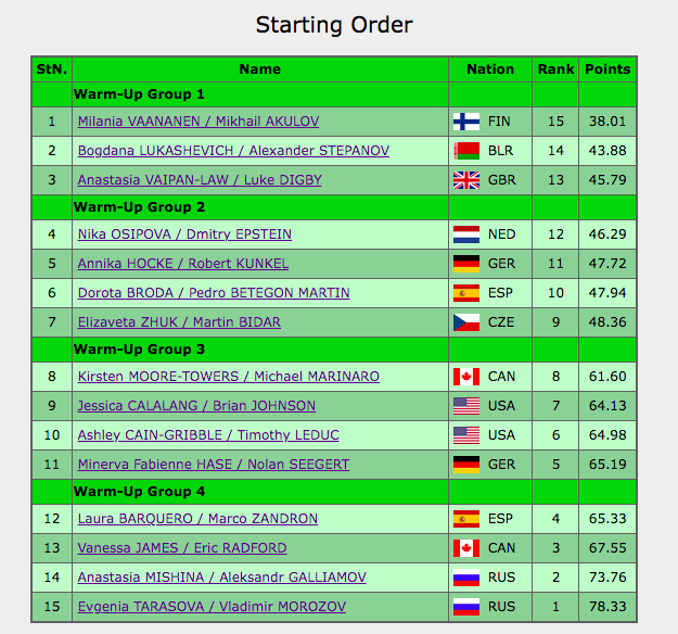 Началась разминка финальной группы участников, где выступят действующие чемпионы мира из России Анастасия Мишина / Александр Галлямов и ученики Этери Тутберидзе Евгения Тарасова / Владимир Морозов. Также здесь выступят канадцы Ванесса Джеймс и Эрик Редфорд.