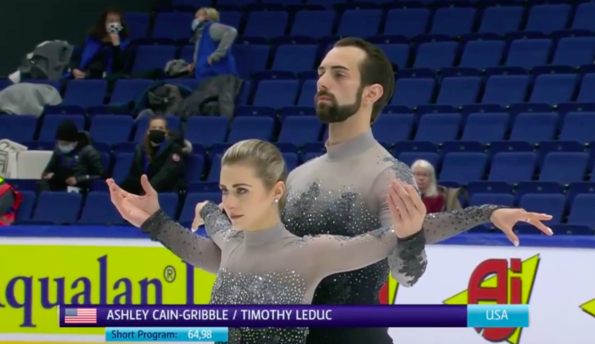 Следующими выступают еще одни американцы Эшли Кейн-Гриббл и Тимоти Ледук. Они катаются под известную в мире фигурного катания лиричную композицию из скрипок и пианино Dance For Me Wallis (Abel Korzeniowski).