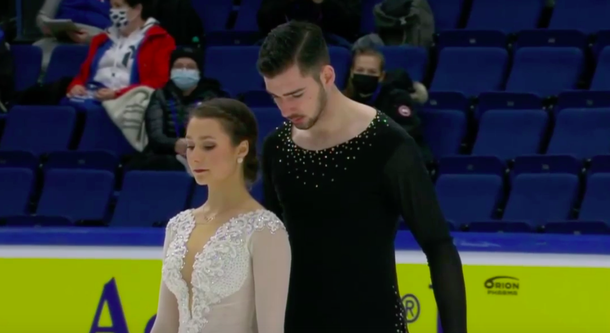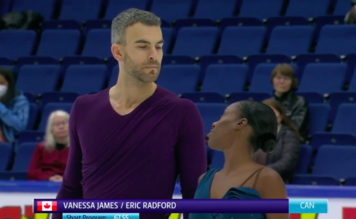 На льду Ванесса Джеймс и Эрик Редфорд из Канады. Они катаются под Falling (Harry Styles).