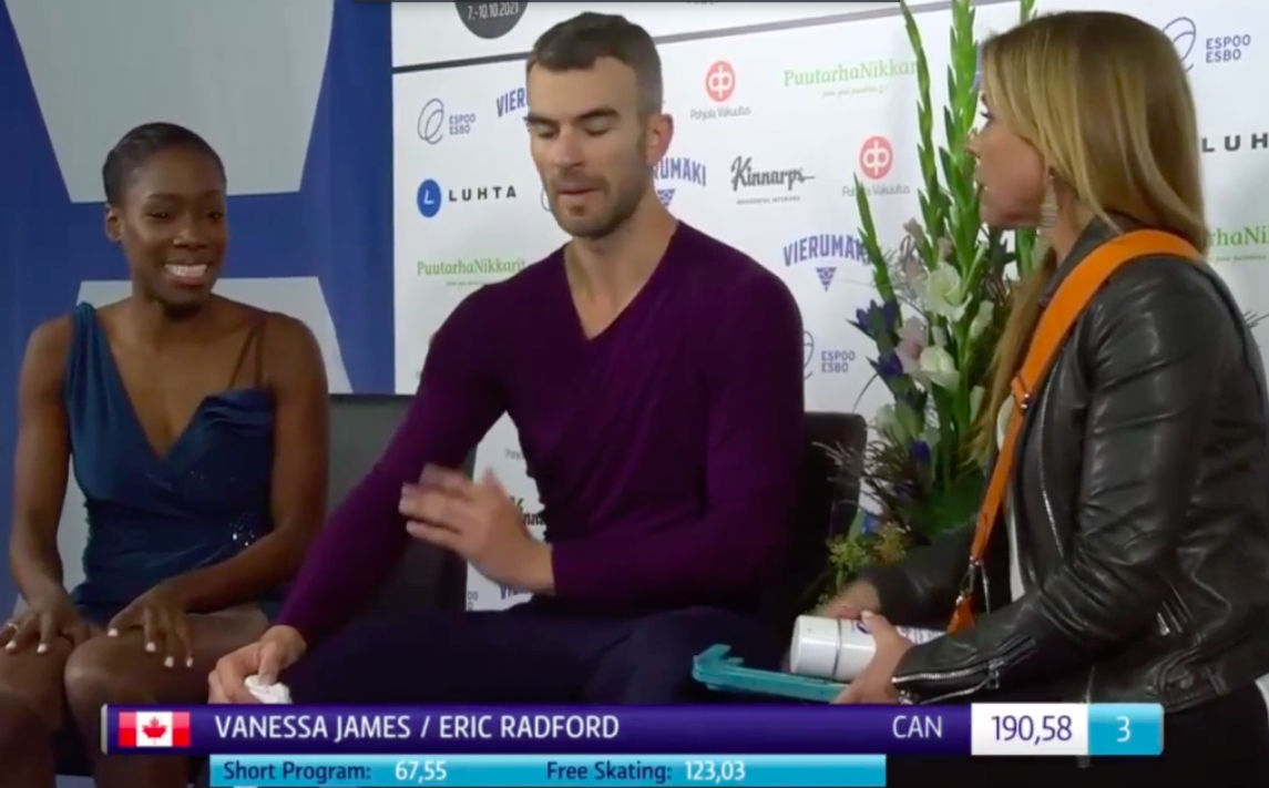 После финальной позы Ванесса смеется и жестами пытается объяснить партнеру, что же она натворила на прыжках. Значит, все-таки это она ошиблась, когда не стала исполнять каскад. Тренер пары тоже смеется. Что ж, это пока не столь важный турнир, так что можно допустить ошибки.