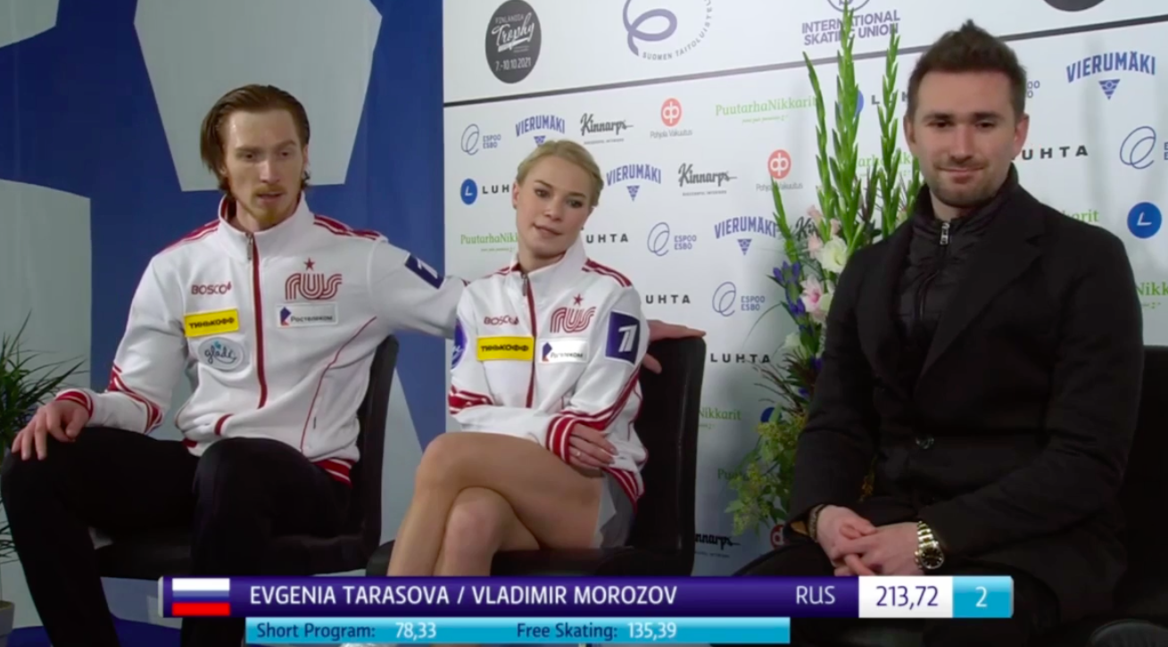 На втором — Евгения Тарасова и Владимир Морозов, которые уступили своим соотечественникам чуть более 13 баллов (213,72). Главная причина этому: два падения девушки в произвольном прокате — с первого прыжка в каскаде 3+2 и с выброса.