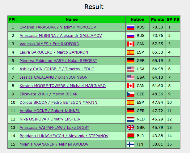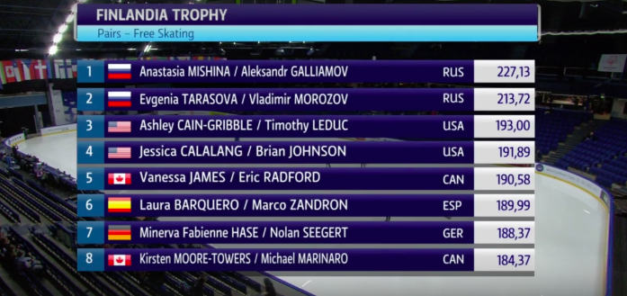 Напомним, что после короткой программы лидируют Тарасова / Морозов (78,33 балла), на втором месте — Мишина / Галлямов (73,76 балла), на третьем — Джеймс / Редфорд (67,55).