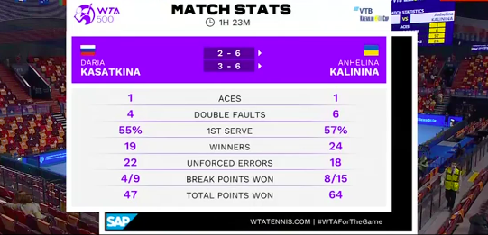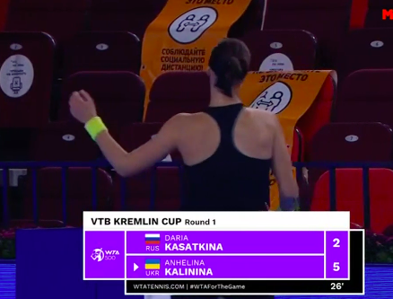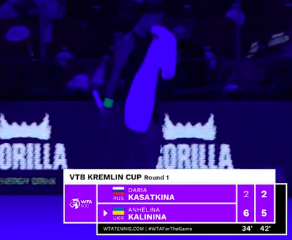 Калинина на подаче. Украинка так мощно подала, что Касаткина с трудом отбила мяч — тот взмыл «свечой». В итоге украинка вышла к сетке и спокойно отправила мяч в недосягаемую для россиянки часть корта — 15:0.