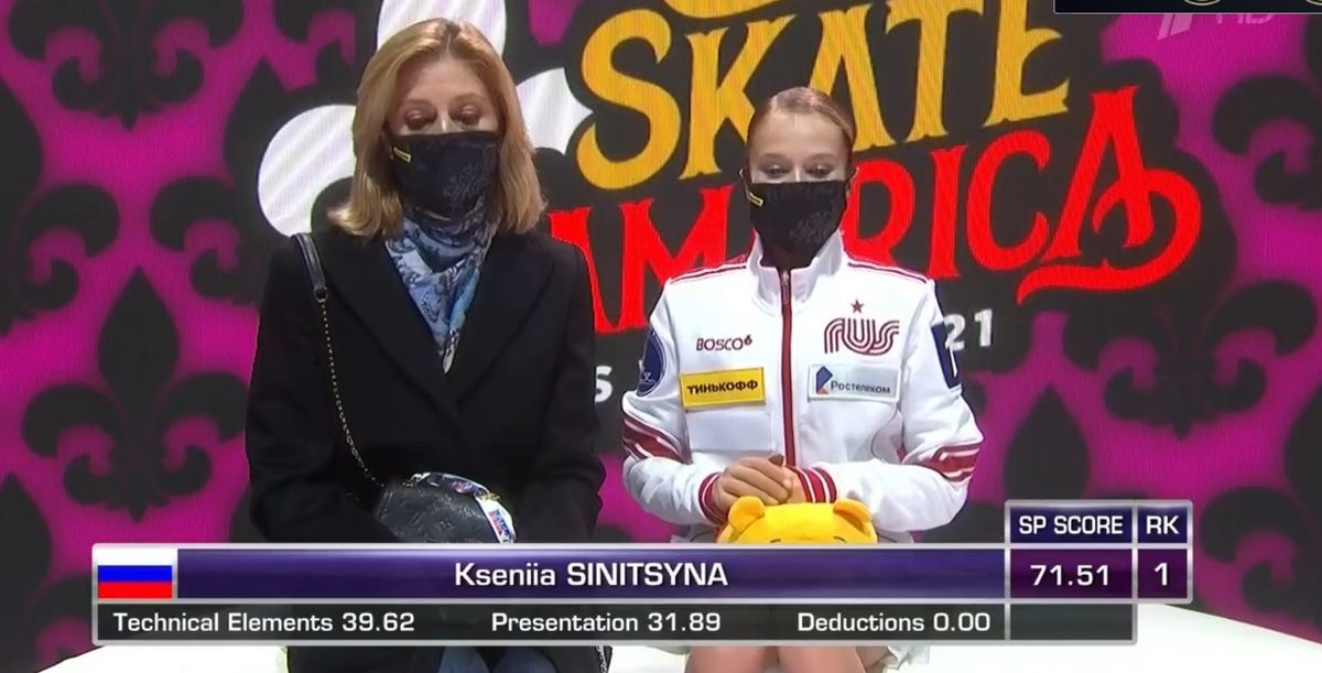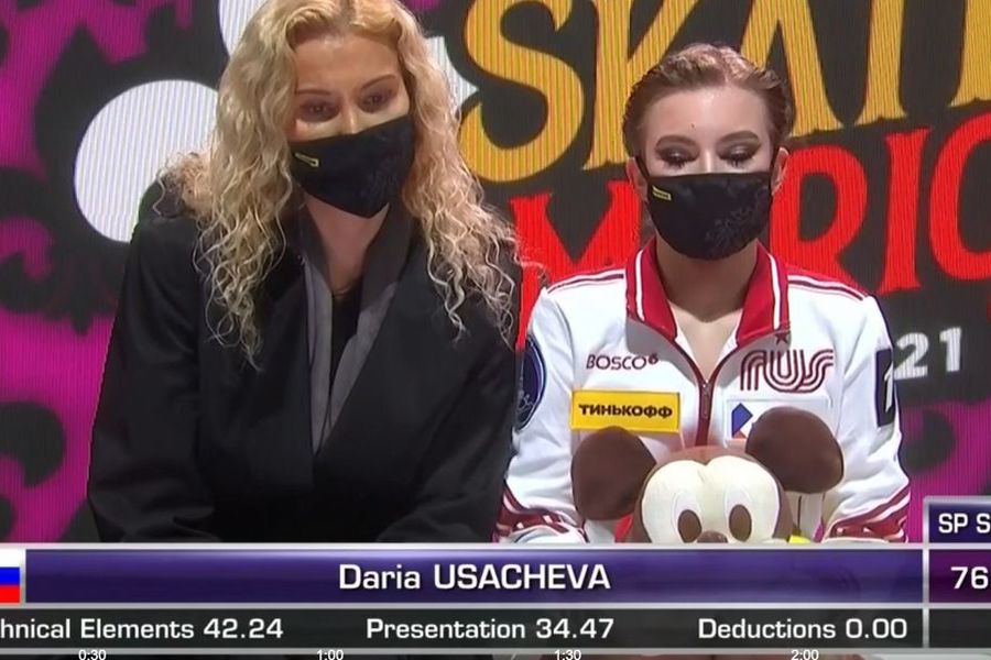 На последней тренировке Трусова чисто исполнила короткую программу во время проката под музыку, но не пыталась геройствовать и делать тройной аксель — ограничилась двойным, причем явно испытала боль на приземлении. Также ей удались тройной флип и каскад тройной лутц + тройной тулуп.