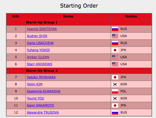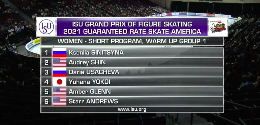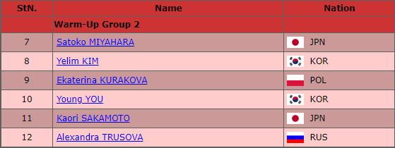 Началась разминка у девушек из второй группы, в которой будет выступать и Александра Трусова.
