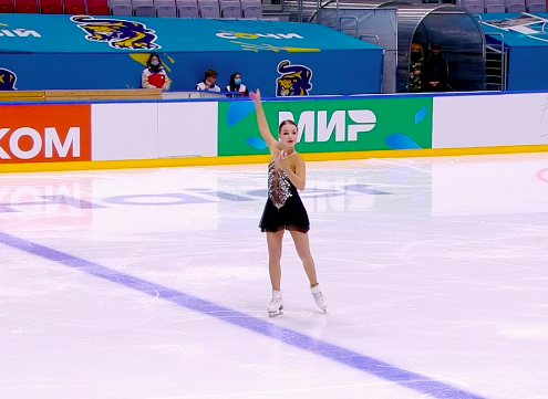 Следующей выступает Софья Самоделкина — ученица Сергея Давыдова из ЦСКА. Она катается под лиричный саундтрек к фильму «Лето 42-го».