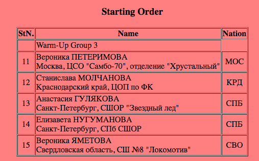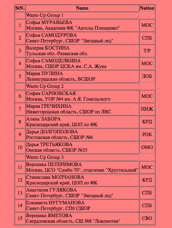 Самоделкина исполнила тройной аксель и захватила лидерство (75,21 балла), Муравьева просто шикарно откатала свою программу и стала второй (73,33), а промежуточное третье место неожиданно заняла Яметова из Свердловской области (66,72). Гулякова лишь пятая (62,20), поскольку сделала двойной флип, который запрещено исполнять в короткой программе, и потеряла элемент; Самодурова — восьмая (57,75), потому что потеряла каскад, Нугуманова — вообще 12-я (52,53 балла), поскольку исполнила одинарный лутц (не засчитан) и упала со второго прыжка в каскаде.