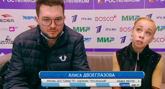 Следующей выступает Алиса Двоеглазова из группы Тутберидзе. Начинается заруба за золото. Двоеглазова катается под элегантную увертюру Funny Honey (Renee Zellweger & John C. Reilly & Colm Feore & Taye Diggs).