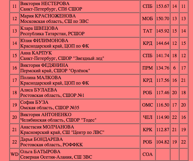 Не обошлась без падений и Анна Карпук. Тем не менее, общее техническое исполнение было на порядок лучше всех девушек, выступавших до нее. За произвольную программу юная петербурженка получает 98,63 балла, ее общий результат составил 141,74.