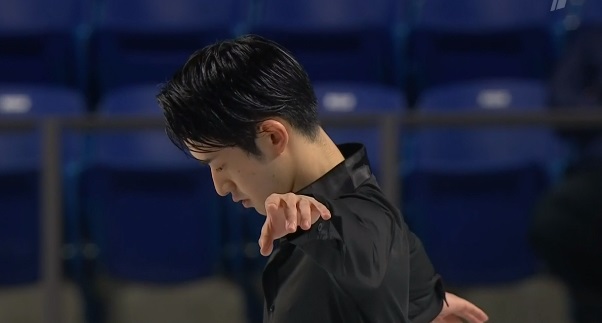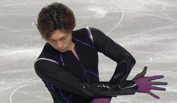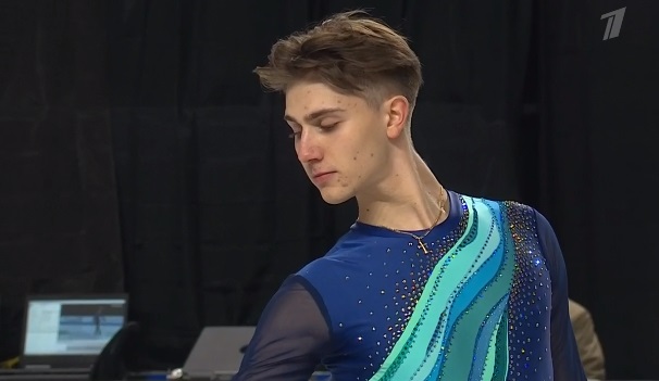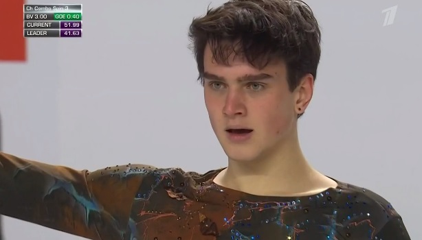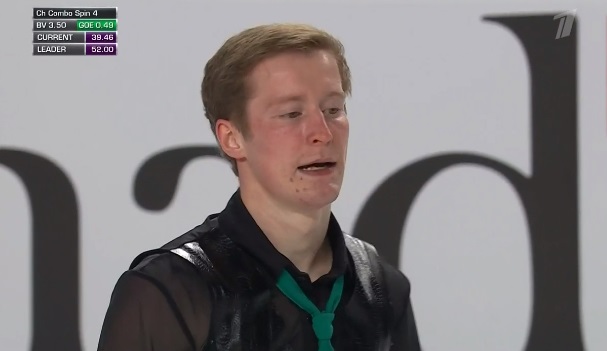 Начал с каскада 4 тулуп + 3 тулуп. Добролся и выехал чисто! А вот на четверном сальхове его закрутило слишком сильно, и случилось падение. Отвращался на четвертый уровень, во второй части программы сделал чистый тройной аксель. Дорожку шагов оценили тоже максимальным, четвертым уровнем. Несмотря на ошибку, достойное выступление. Он даже, падая, смог выездом сократить минус.