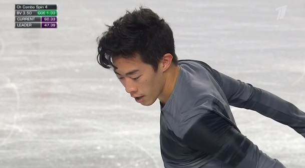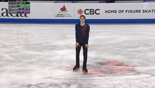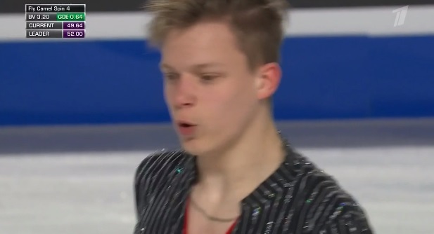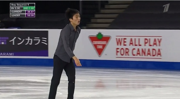 Зашел с отличного четверного тулупа, а вот дальше вместо тройного акселя прыгнул лишь не оценивающиеся в сольном прыжке два оборота и лишился элемента. Каскад сделал 3 флип + 3 тулуп. Дорожка шагов была третьего уровня. Вращения — на четвертый.
