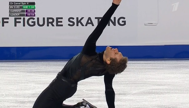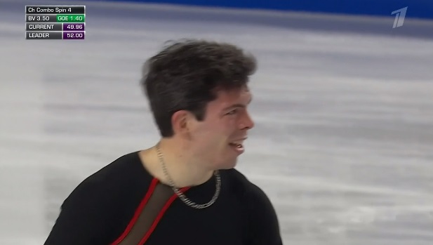 Начал с чистого четверного сальхова, чуть поборовшись на выезде. А вот затем в каскаде из четверного и тройного тулупов допустил приземление на две ноги, и второй прыжок смог только на два оборота выкрутить. После этого был лишь второй уровень на вращении, зато справился с тройным акселем. Дорожка шагов вышла на третий уровень сложности. Остальные вращения — на четвертый.