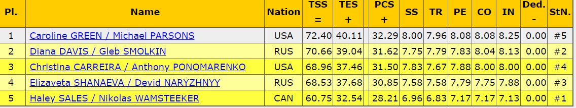 Судьи ставят американским фигуристам 68,96. Они опережают Шанаеву и Нарижного, однако сместить Дэвис и Смолкина с первым местом не удалось.