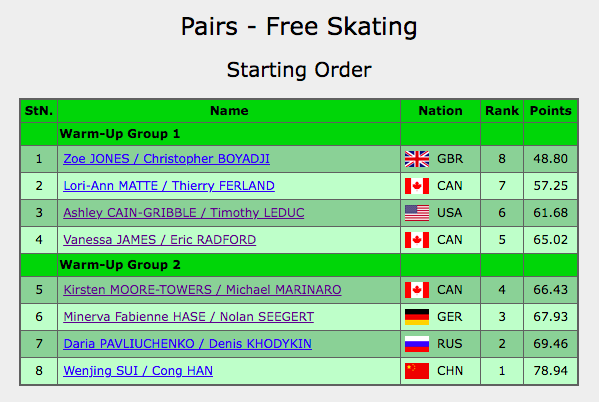 Канадская пара Лори-Анн Матте и Тьерри Ферланд вызывает овации зала! Неплохо выступление, хотя ошибок было немало. И на тройном сальхове ошиблись, и на каскаде, но по технике предыдущую пару они обошли очень солидно. Выбросы у пары получились отличными. 111.56 за произвольную, 168.81 в сумме. Бьют ребята свой личный рекорд.