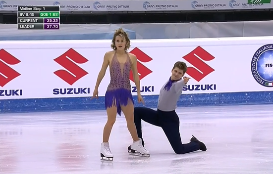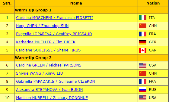 Хозяева льда Каролина Маскени и Франческо Фьоретти открывают соревнования. Не самое лучшее выступление пары, большого впечатления ребята не произвели. Оценка — 55.79.