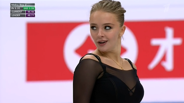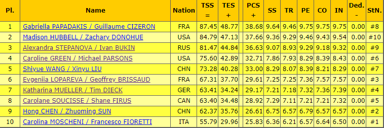 Французы Евгения Лопарева и Джоффре Бриссо неплохо выступили. По технической оценке они обошли китайцев, а вообще пара очень интересная и перспективная. Оценка — 67.31. Они становятся лидерами.