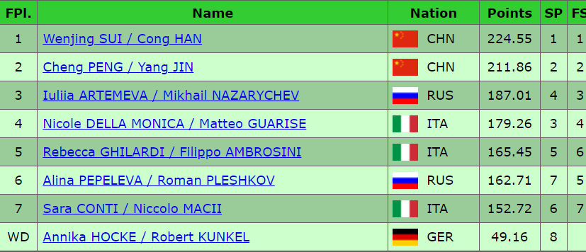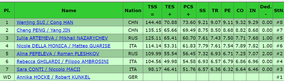 Финальные оценки в произвольной программе спортивных пар. Китайский дуэт получает 144,48 балла, что дает им 224,55 балла. Это уверенное первое место!