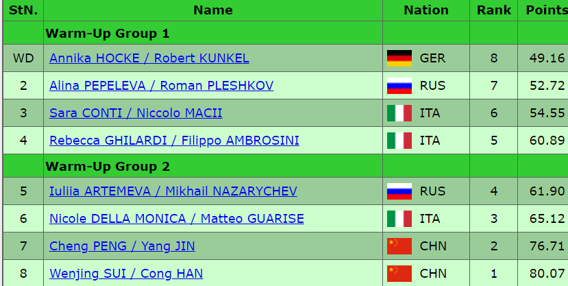 Итак, откроет эту разминку российская пара Алина Пепелева и Роман Плешкова, поскольку немецкий дуэт принял решение сняться.