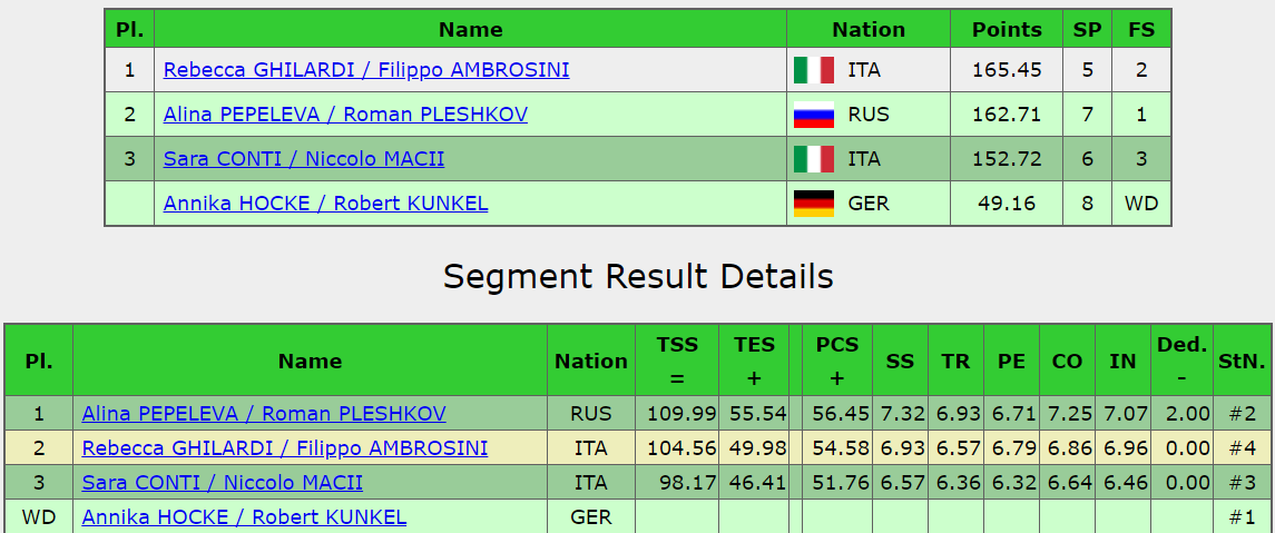 Судьи оценивают прокат итальянской пары в 104,56 балла. Это дает им в общей сумме 165,45 балла. Опережают они российский дуэт.