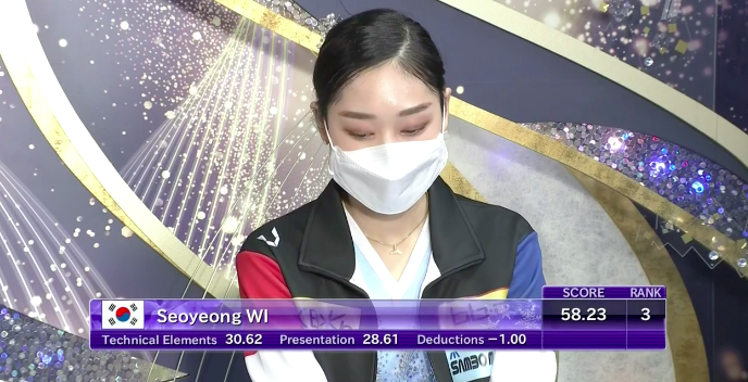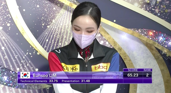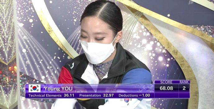 Сдержанное, холодное, но при этом прекрасное в своей мрачности выступление удалось Ю Ен. Она исполнила все вращения на максимальный, четвертый уровень, а дорожку шагов — на третий. Тем не менее кореянка недовольна собой из-за падения — даже слезы видны на глазах.