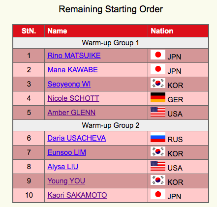 Следующей выступает Каори Сакамото из Японии. Она катается под Now We Are Free (саундтрек к фильму «Гладиатор», авторы — Lisa Gerrard, Hans Zimmer, исполнение — Cedric Tour).