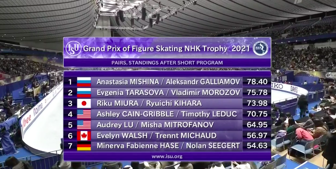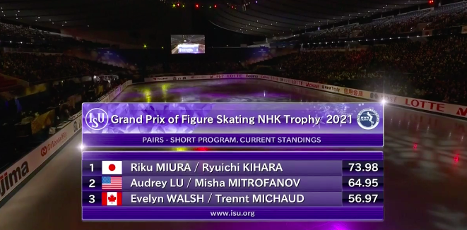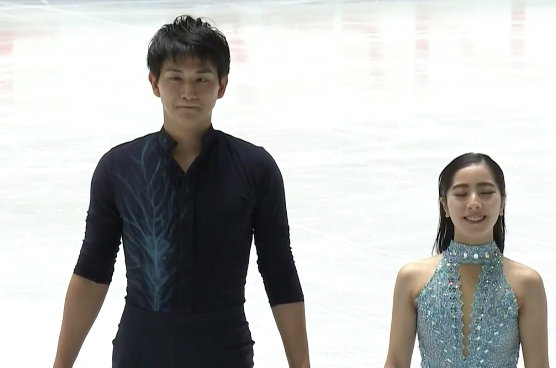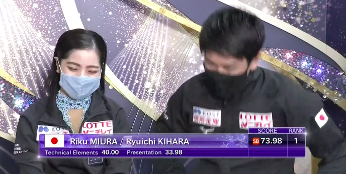 Оценка Миуры и Кихары за короткую программу — 73,98 балла. И они выходят в лидеры турнирной таблицы! Это их новый личный рекорд.