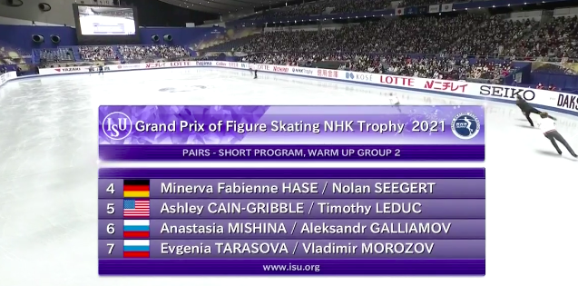Началась разминка второй группы участников, в которой мы увидим выступления российских пар — Анастасии Мишиной и Александра Галлямова, а также Евгении Тарасовой и Владимира Морозова.