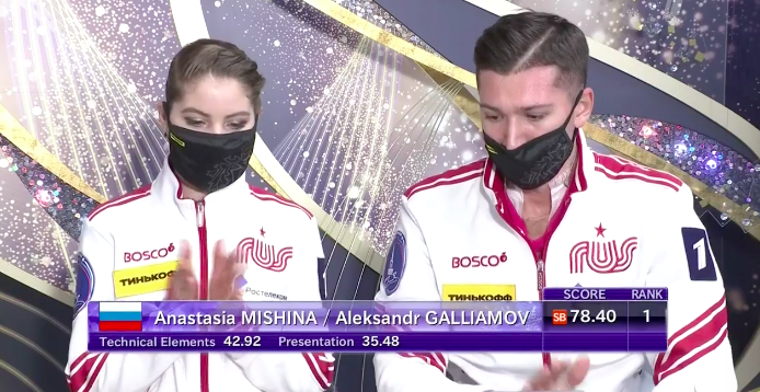 Оценка Мишиной и Галлямова за короткую программу — 78,40 балла. Они выходят на первое место с отрывом от японцев почти в пять баллов! Это личный рекорд российской пары. Поздравляем!