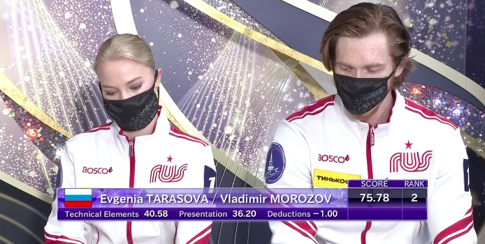 Оценка Тарасовой и Морозова за короткую программу — 75,78 балла. Это второй результат после Мишиной и Галлямова. Две российские пары захватили лидерство в таблице по итогам короткой программы!
