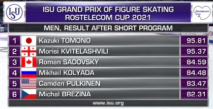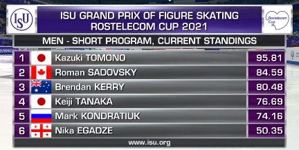 Не очень удачной для россиян получилась короткая программа на этапе Гран-при в Сочи. Михаил Коляда только четвертый, а также борющийся за попадание в финал серии Евгений Семененко — седьмой. Но на самом деле отыграться шансы еще будут, нужно только чисто отработать произвольную. Спасибо, что были с нами и до новых встреч. Трансляцию вел Александр Седов.