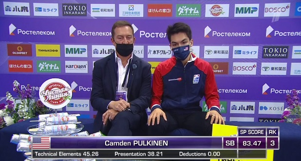 В начале добротный четверной тулуп, затем чистый тройной аксель, а во второй части проката каскад 3 лутц + 3 тулуп, и вот в нем случилась ошибка на выезде со второго прыжка. Вращения и дорожка и у Пулкинена были на четвертый уровень.