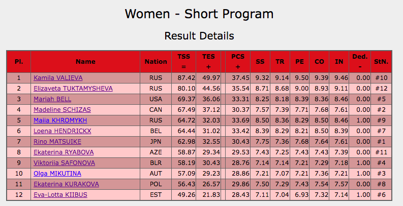 Уже признанная мировая звезда Валиева чувствовала себя намного увереннее Хромых и все элементы исполнила спокойно, с запасом по высоте. Чистый тройной аксель, тройной флип и каскад тройной лутц + тройной тулуп принесли ей 87,42 балла и новый мировой рекорд. Предыдущий принадлежал Алене Косторной — 85,45.