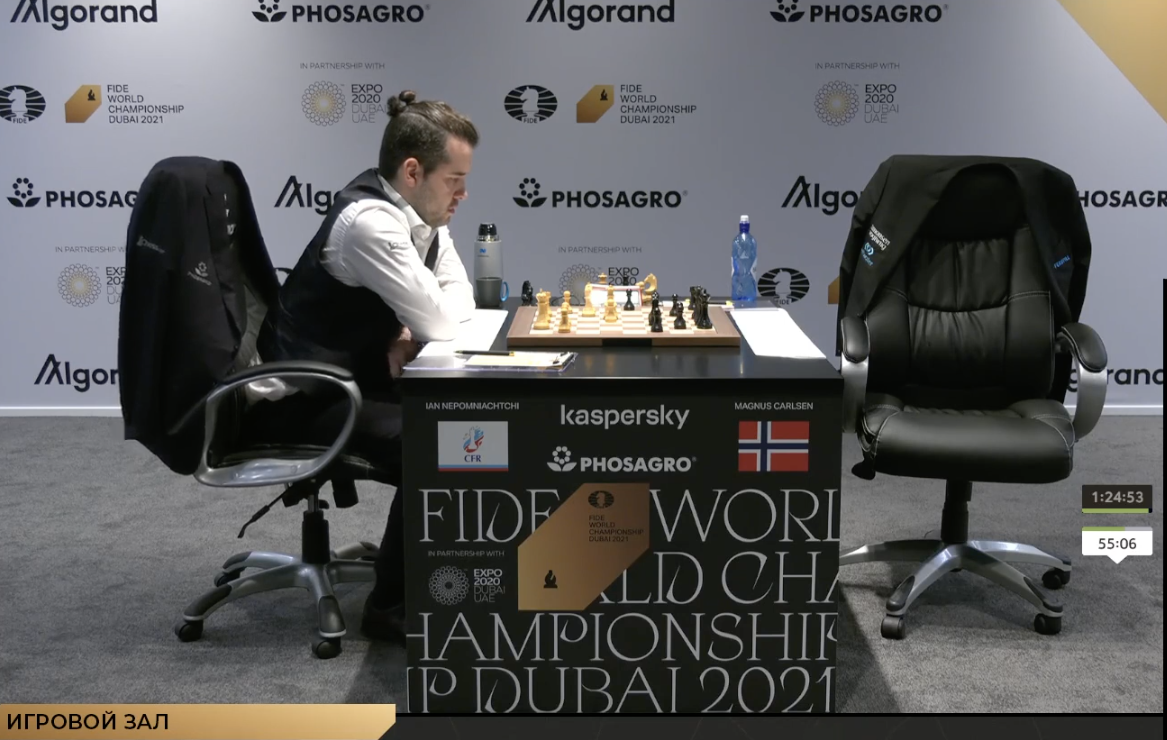 Всего два хода за последние 20 минут сделали гроссмейстеры. Видимо, расчет на смелую игру, который, как казалось, будет использовать Магнус, не оправдался.