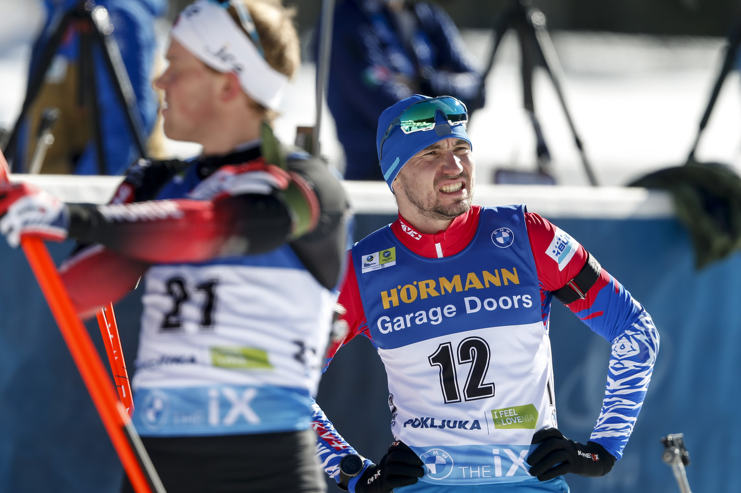Норвежец Андерсен финиширует. Он на дистанции упал очень серьезно, проехался на животе несколько метров.