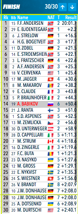 Бабиков с шестью промахами финишировал 14-м, отстав от лидера на 50,4 секунды. Совсем безрадостно.