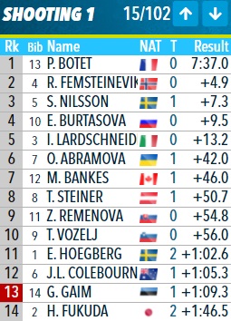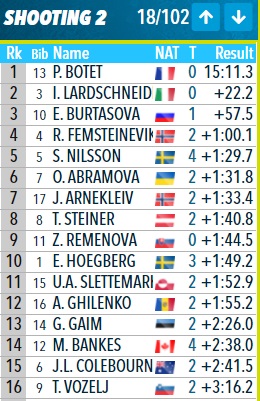 Буртасова стреляет чисто и сразу выходит на четвертое место. 9,5 секунд уступает француженке Боте.