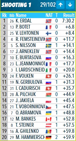 Шведка Андерссон, стартовавшая в девятом десятке, отработала чисто оба огневых рубежа и ушла на последний круг с четвертым результатом. Но она проигрывает 31 секунду Эрдаль, в то время как ушедшая с рубежа с третьим временем Боте уступала 12.