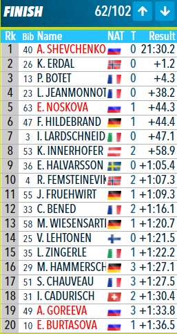 Буртасова финишировала с четвертым на данный момент результатом. Проиграла Боте и итальянке Лардшнайд, которые не промахивались, а также пробежавшей на круг больше (два против одного) норвежке Фемстейнвик. Стину Нильссон россиянка опередила, но всего на 8,6 секунды, а ведь у той на три круга больше!
