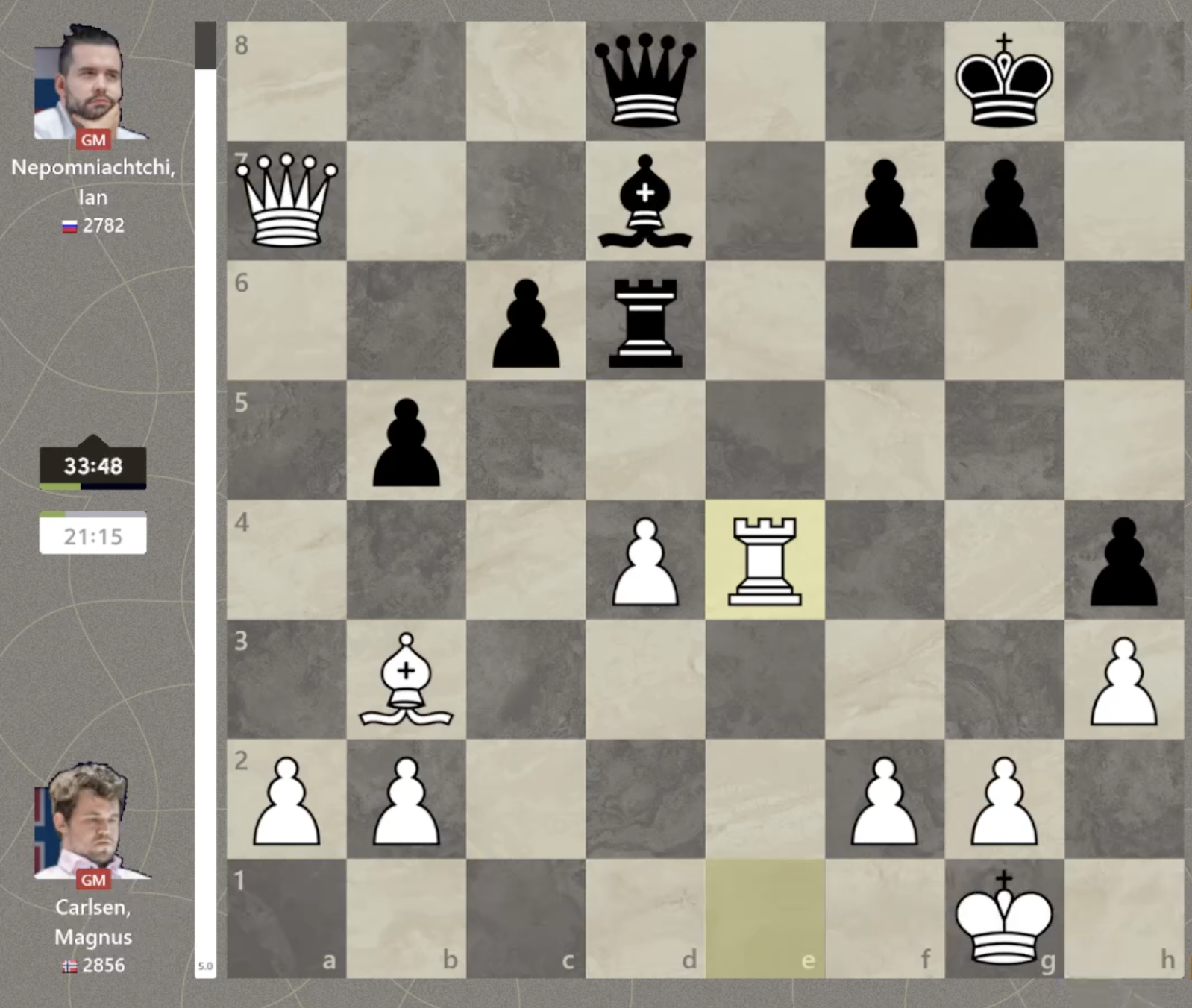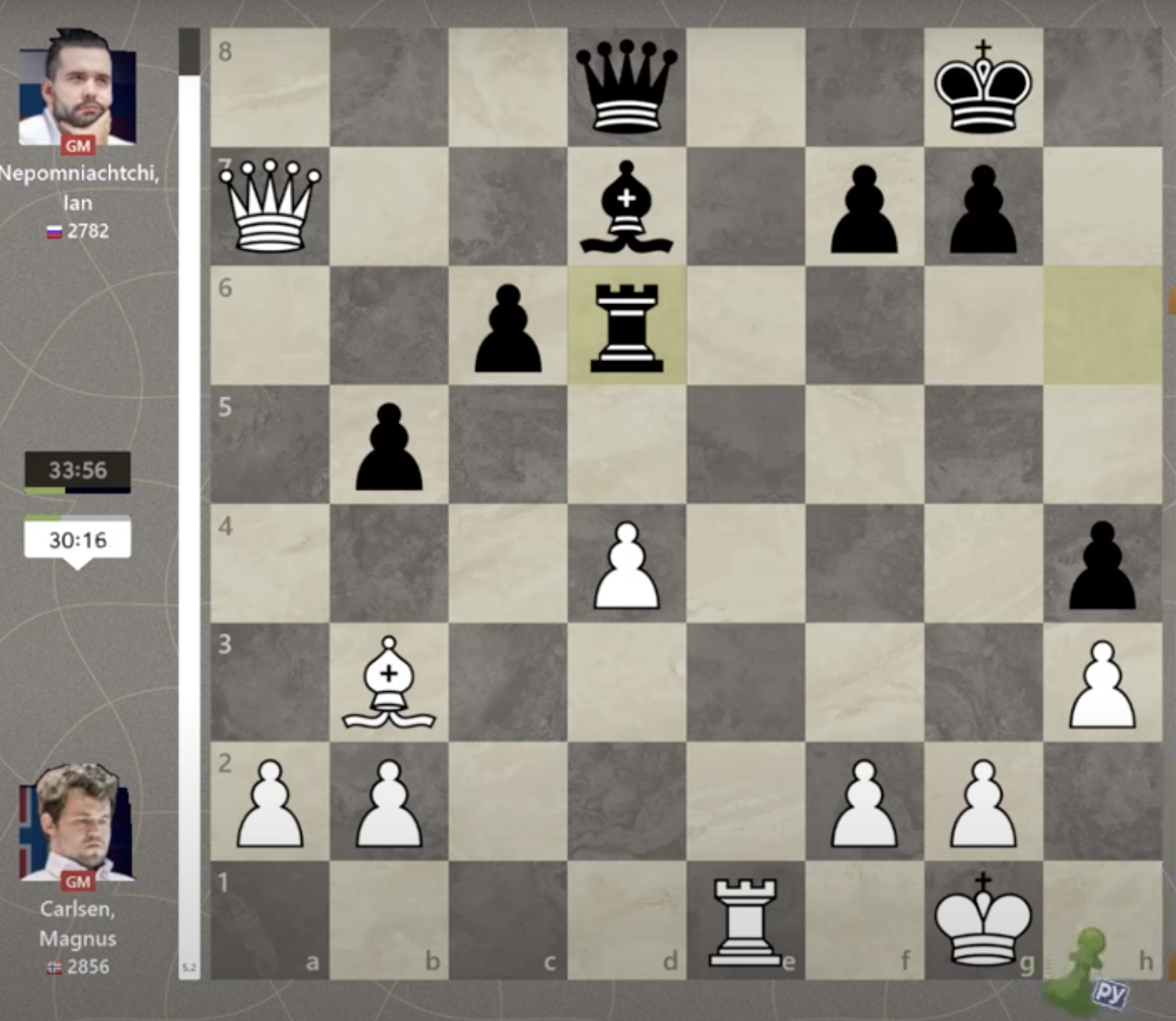 Непомнящий ходит ладьей на d6. Ситуация крайне плачевная, особенно усугубляет ее то, что Карлсен по сути ничего и не сделал выдающегося сегодня.