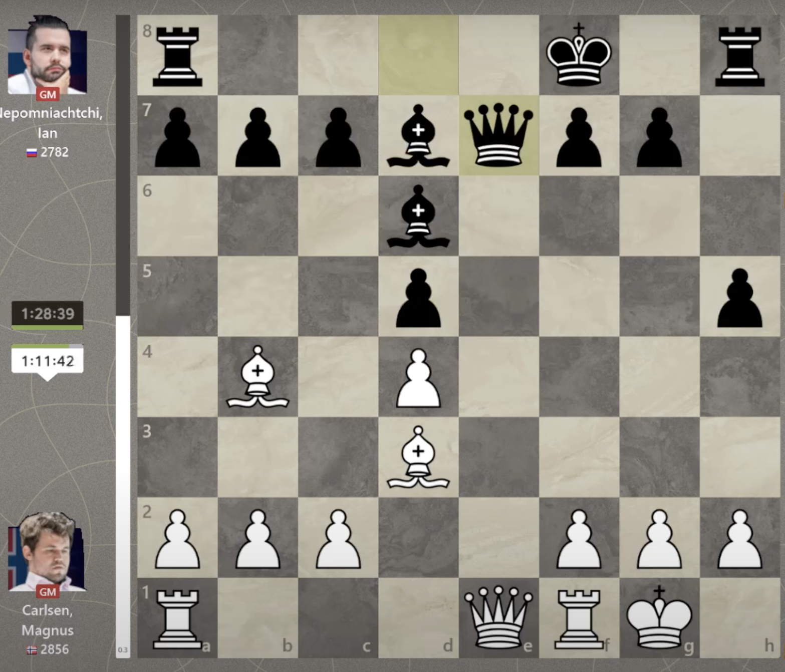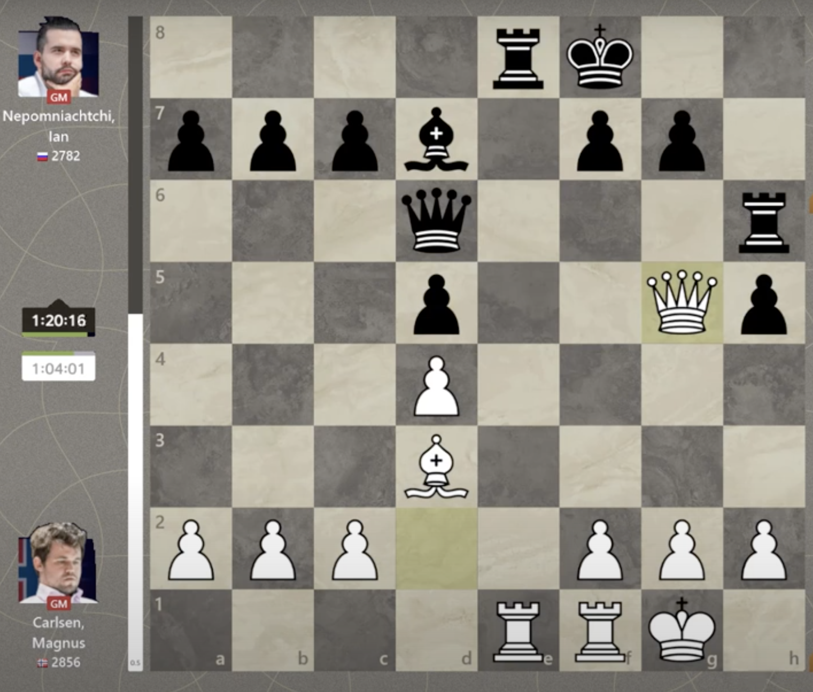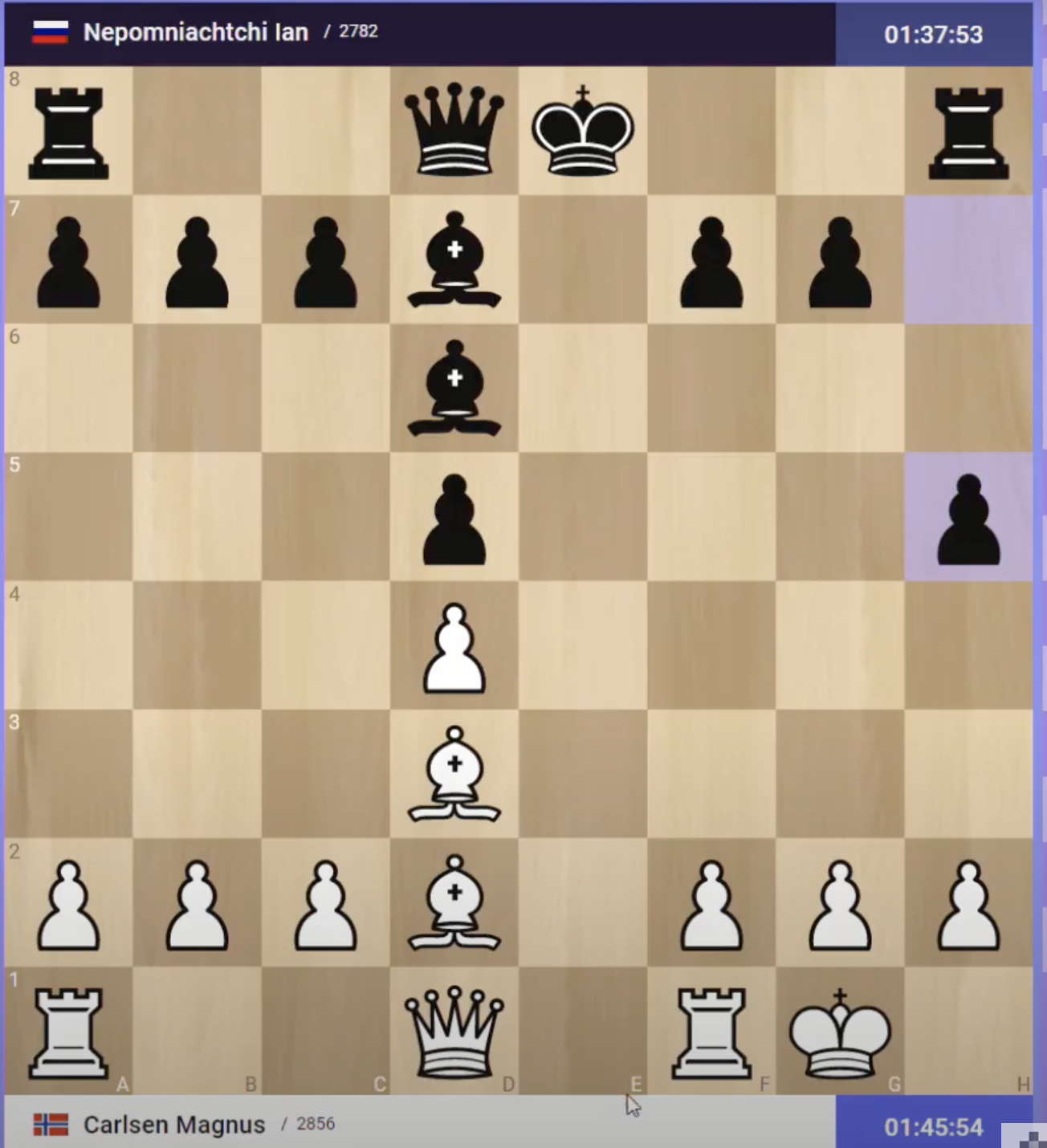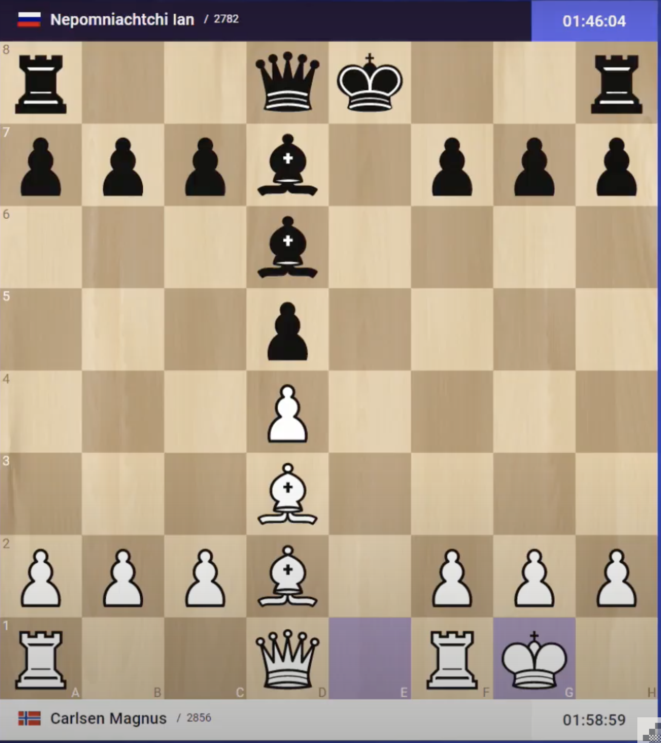 Убирает ферзя Магнус, склоняясь больше к нейтральной позиции.