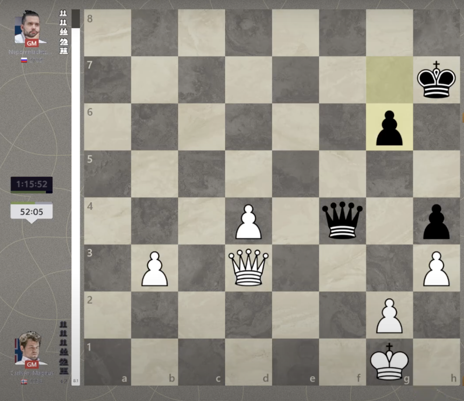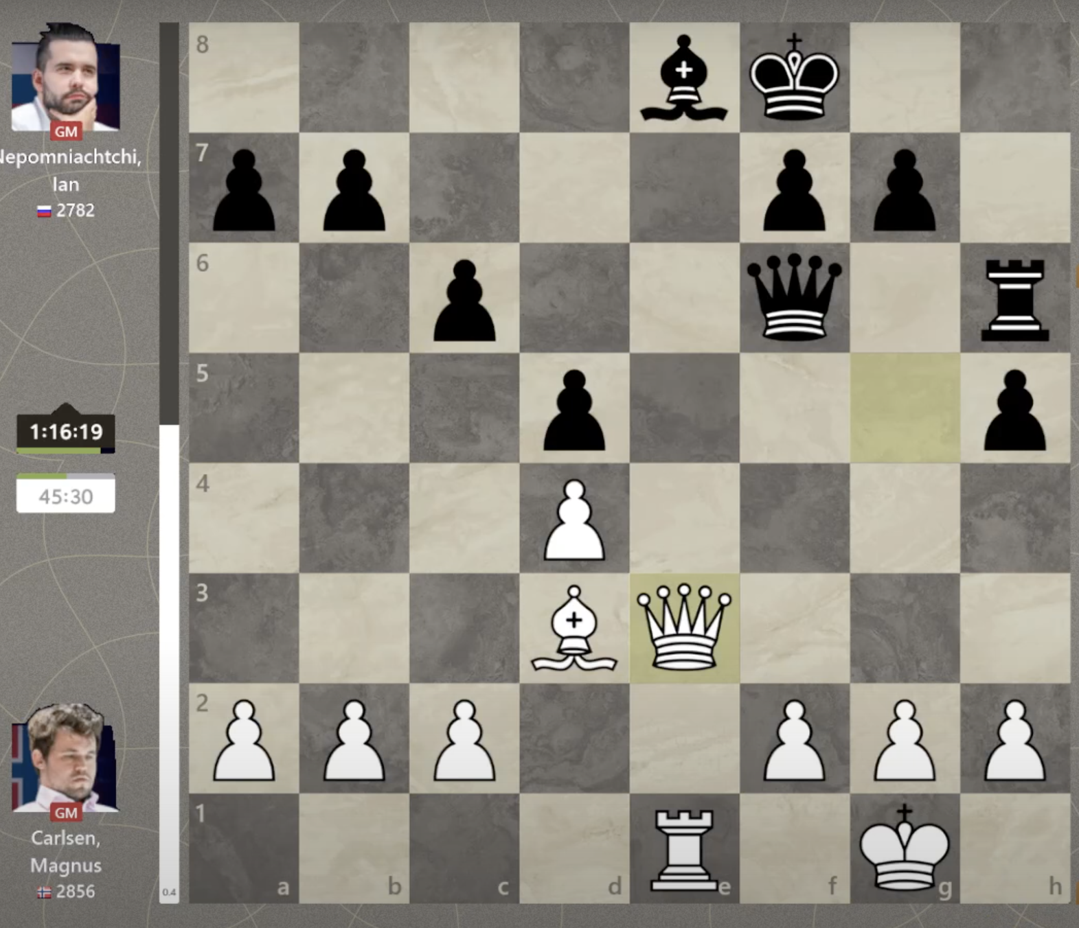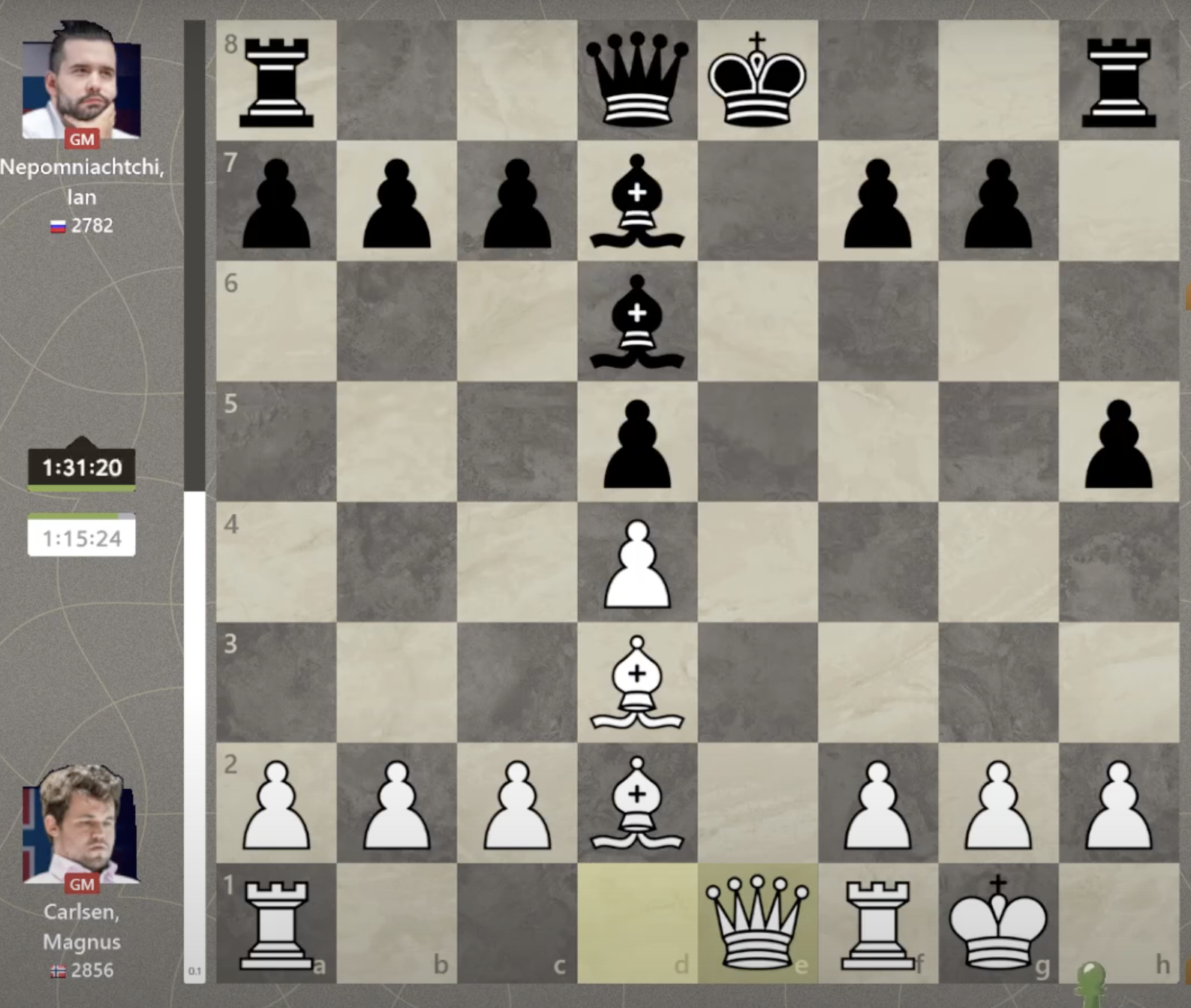 Убирает ферзя Магнус, склоняясь больше к нейтральной позиции.