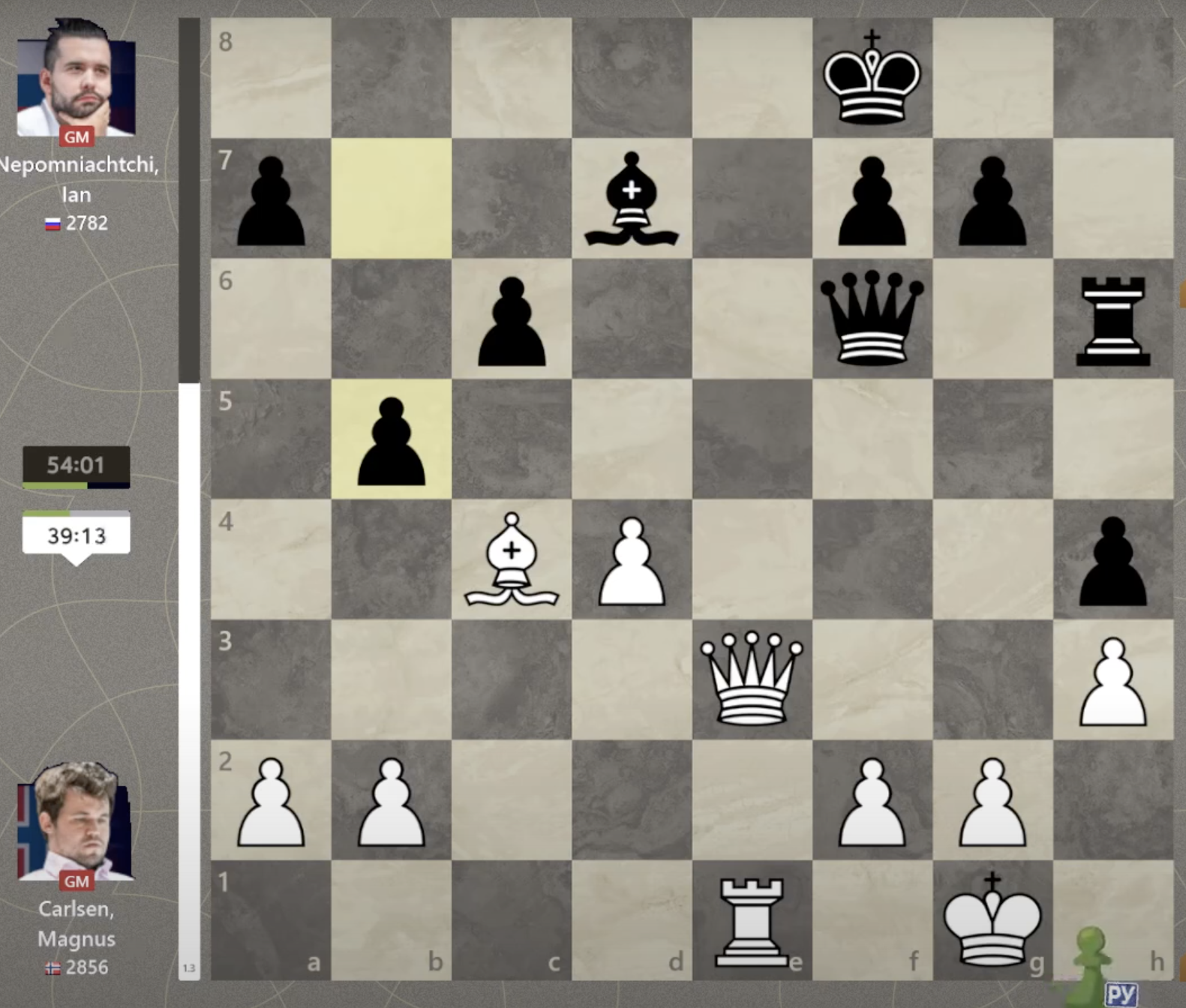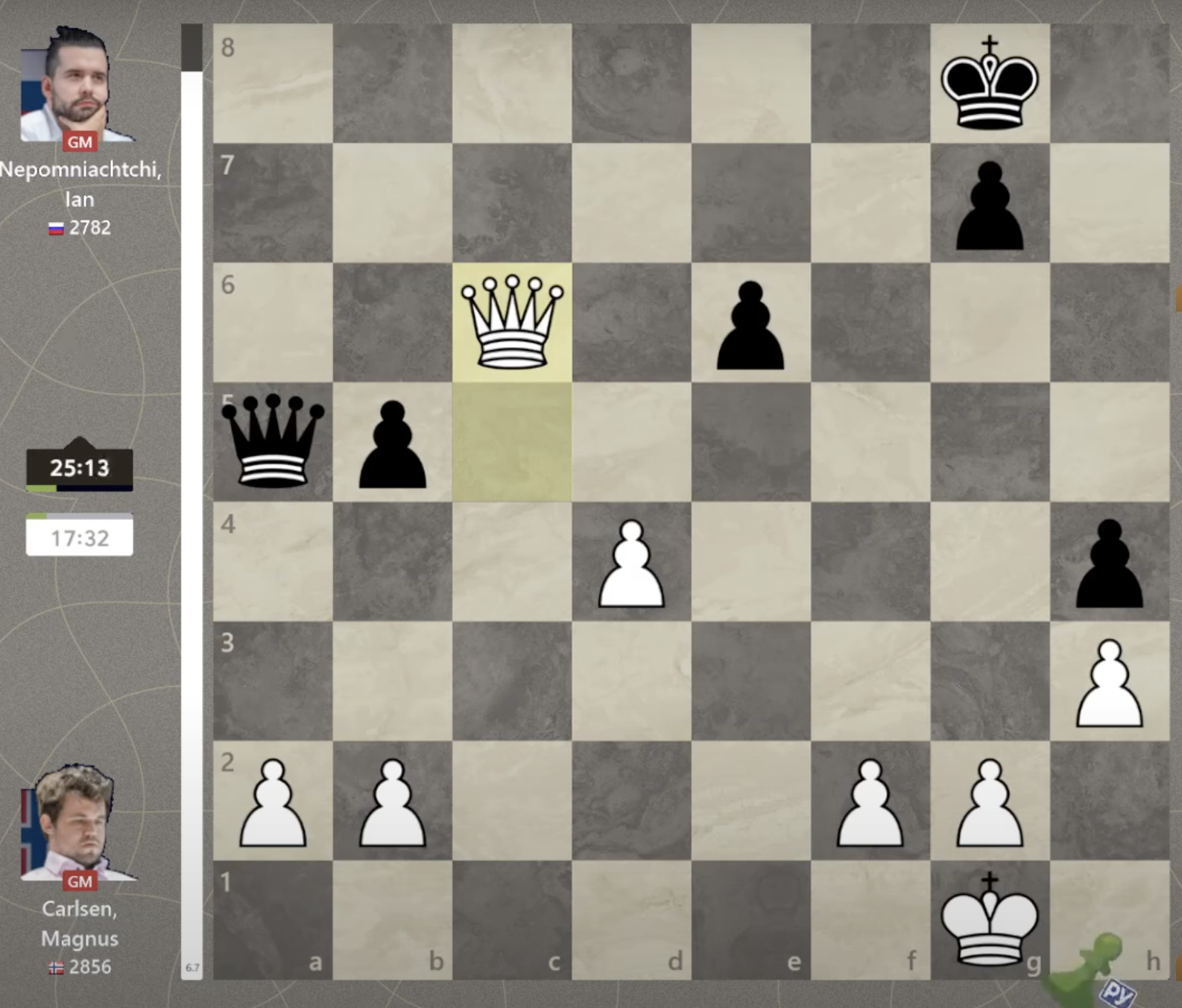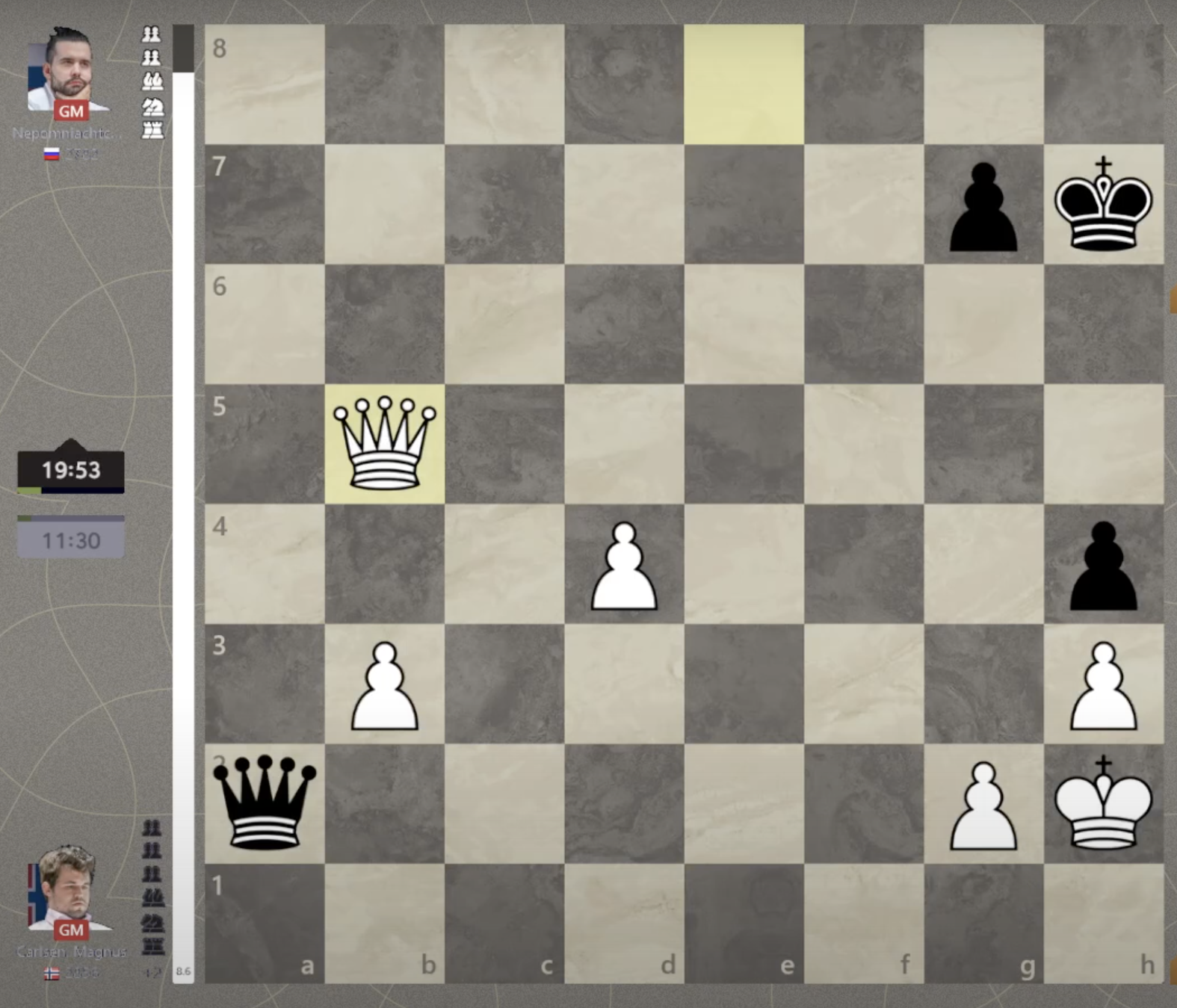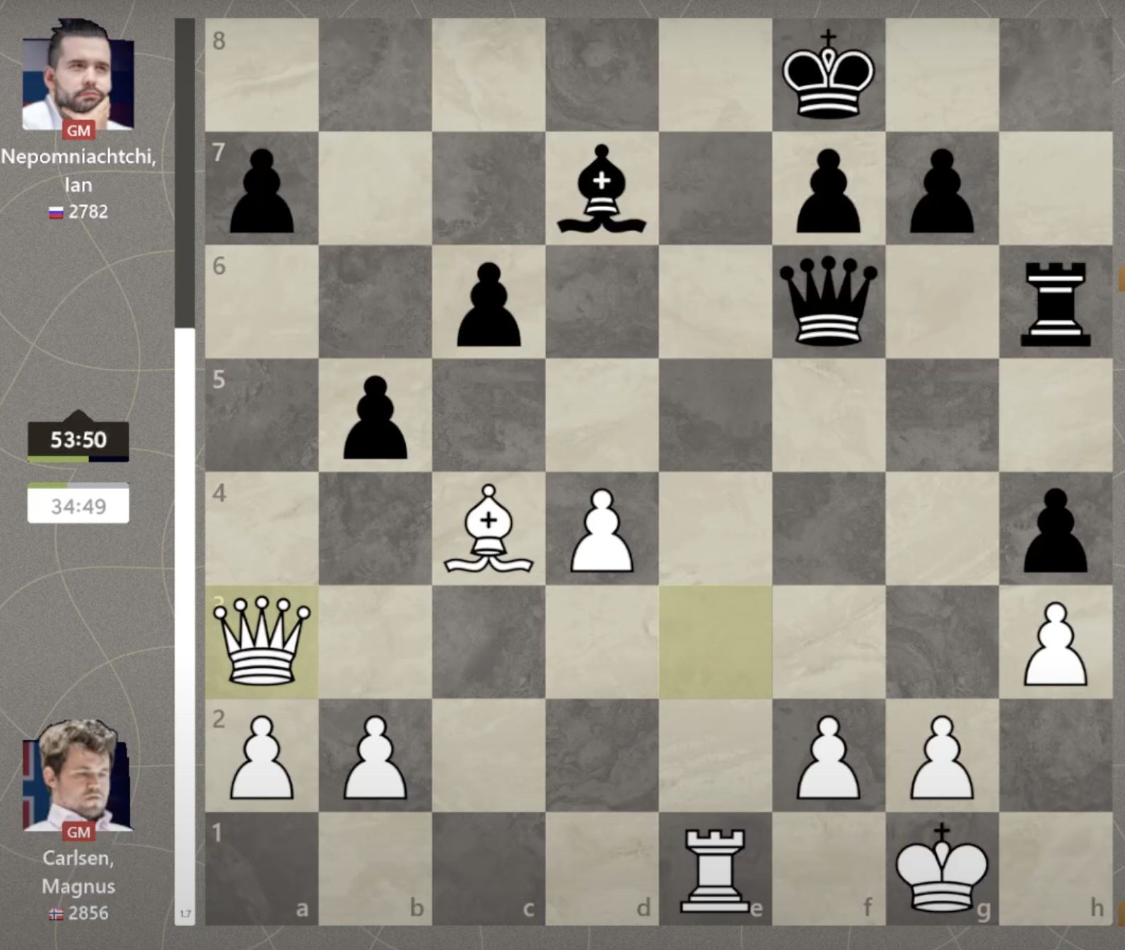 Убирает ферзя Магнус, склоняясь больше к нейтральной позиции.