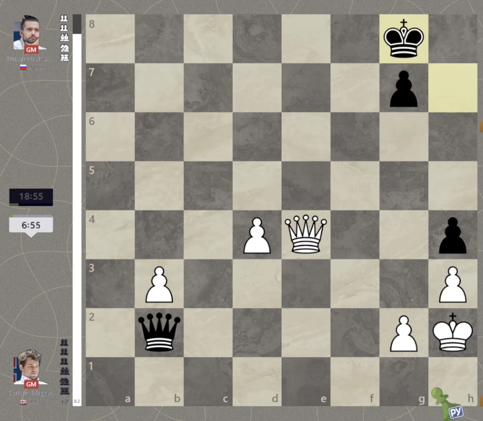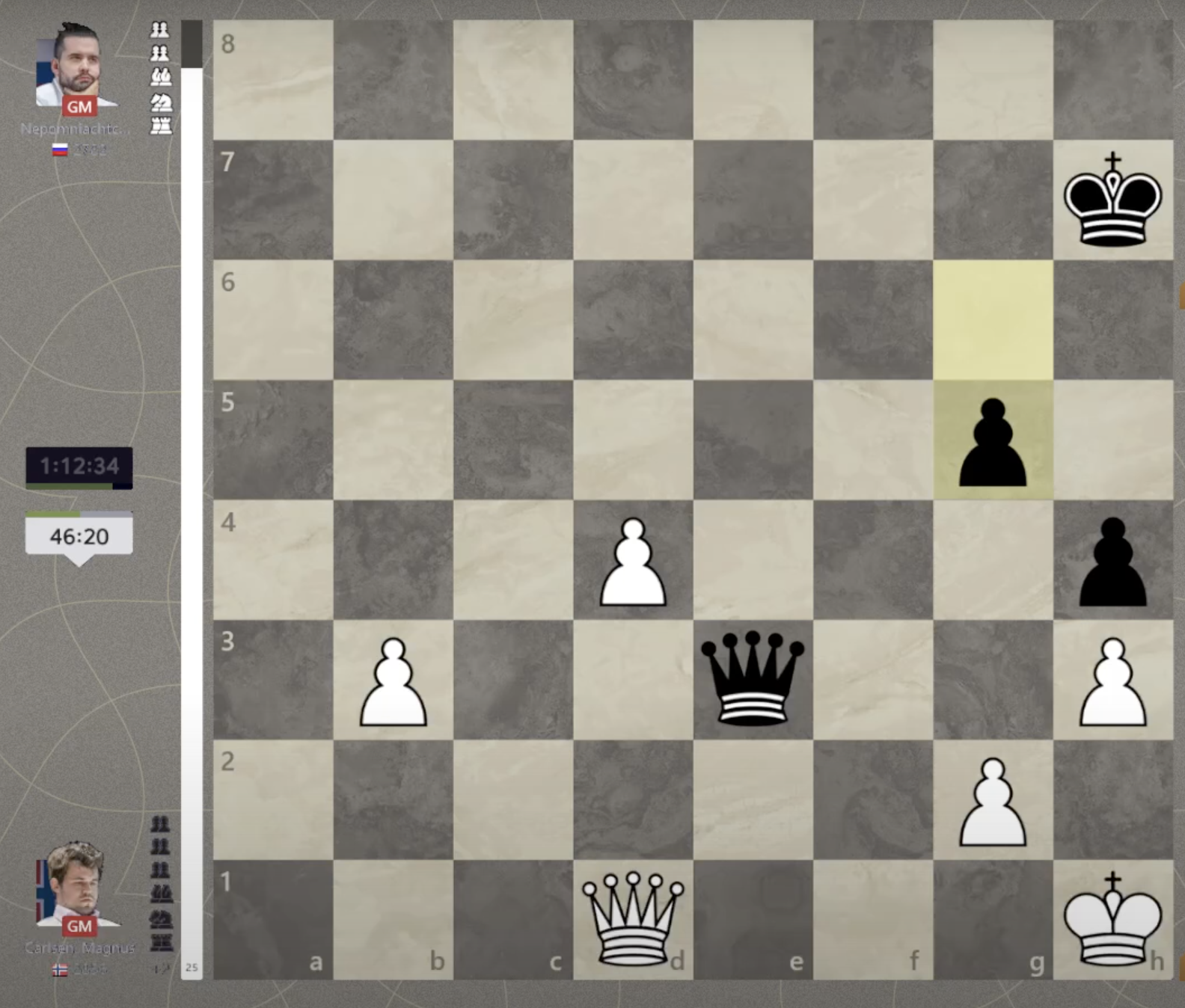 25 минут преимущества во времени есть у Непомнящего, необычные и нестандартные действия Яна заставляют норвежца тратить колоссальное количество внимания, чтобы просчитать все возможные варианты следующего хода.