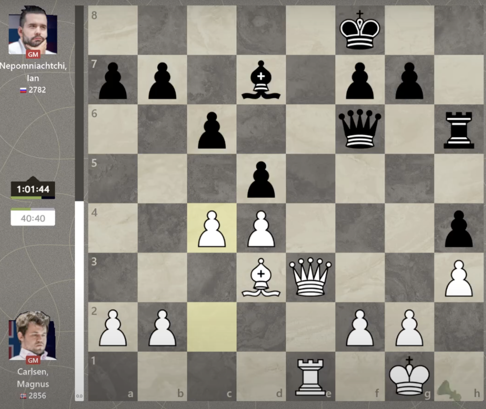 На с4 двинул свою пешку Магнус, небольшой перевес остается у норвежца, по мнению компьютера.