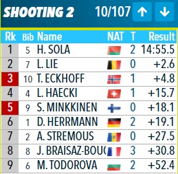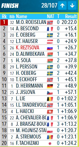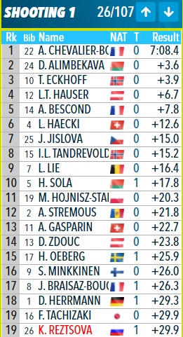Казакевич 19-й была после второй стрельбы, а Кристина Резцова показывает на финише четвертый на данный момент результат, сдвинув на пятое место Динару Алимбекову из Белоруссии. Но еще Ройселанн финиширует. Как минимум она обойдет.