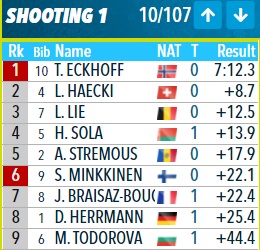 Бреза-Буше убежала на один штрафной круг. Лидирует на первом рубеже пока что отстрелявшаяся чисто швейцарка Лена Хеки.