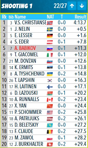 Второй рубеж: тройка лидеров так и приехала на стрельбище вместе, а Бабиков привез вторую группу. У немца доппатрон, у шведа тоже промах, норвежец закрылся. У Бабикова два промаха, но точные доппатроны. Удивил итальянец, который промахнулся первыми шестью выстрелами и побежал на три штрафных.