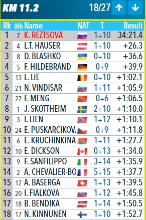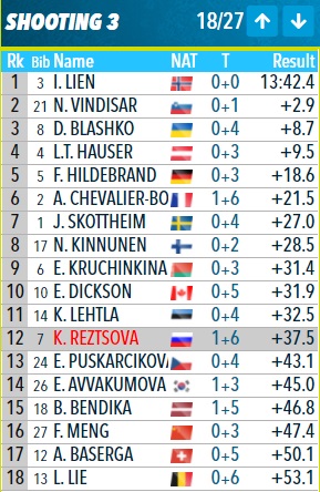 Четвертый рубеж: норвежка Ида Лиен была первой с отрывом. На стойке работала спокойно, но третьим выстрелом промазала, а потом еще и пятым. Но и преследовательницы мазали. Лиен тем временем и третий промах совершила. Первой убежала без промахов Хильдебранд! И пока все мазали, Резцова с промахом первом выстрелом, но пятью попаданиями подряд передала Бабикову эстафету третьей! И всего +7,6!